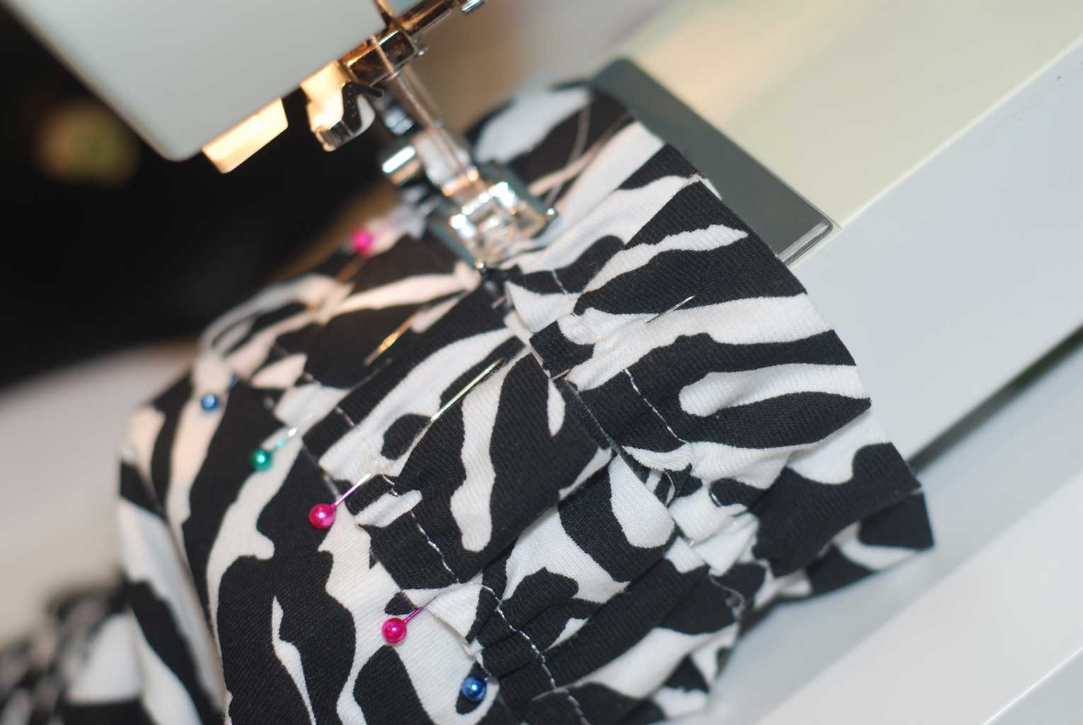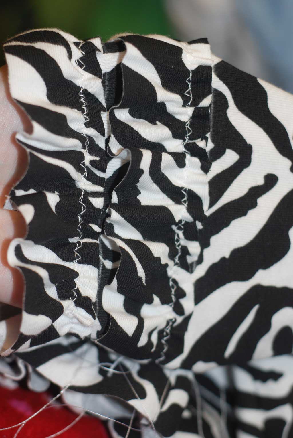 Using a medium width zig zag stitch at your longest length & keeping the gathering seam in the middle of your pressure foot now sew on your ruffles. This works best with a free arm if your machine has that option. Make sure not to over stretch the fabric but to keep it flat & slightly taught. Maker sure to over lap your stitching as well as backstitch when you stop & start.