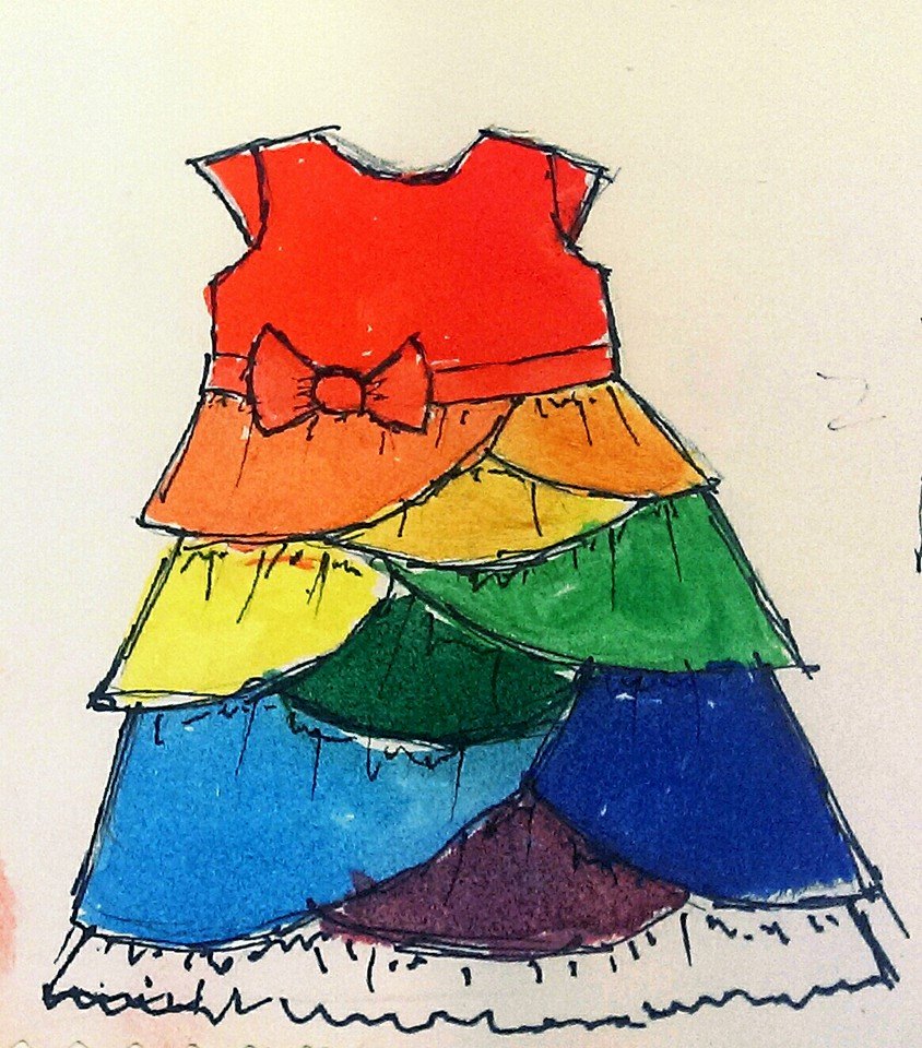 This was the original idea or inspiration sketch!  I was inspired by the skirt on this dress by Paradin’ Around Boutique.  She used random layers of curves between regular layers.  I decided why not do ALL random curved layers and a more classic bodice with a twist (the back is stunning, pics coming soon). I did skip the bottom ruffle, switched out the bodice color & put the bow on the back instead compared to my original sketch, but otherwise I think I got what I was aiming for!
