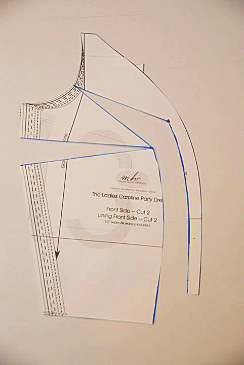 With a soft flexible measuring tape, measure from the top point of the princess seam on your new piece to the waist. Repeat with the original front center piece. For mine, there was a 3″ difference.
