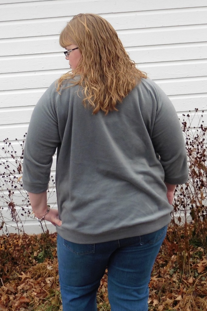 The first thing I did was to cut the bottom off to make it top-length. For my 5’6″ frame, I cut so that from the shoulder point to bottom edge measured about 26.5 inches. I considered taking the side seams in for a closer fit, but after choosing to use this microfleece I decided to leave it looser for coziness.
