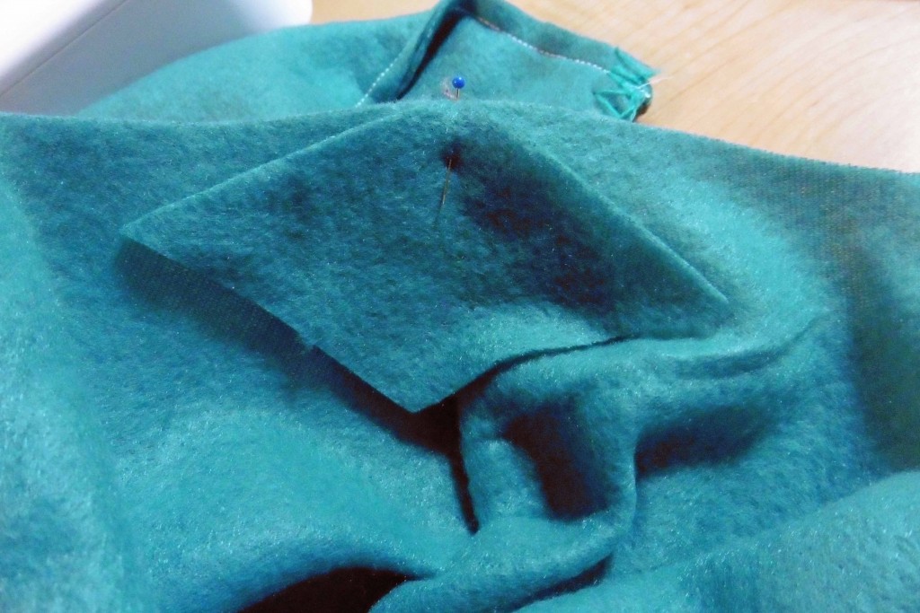 Take your gusset piece and pin it right sides together to the inside out leg, matching one of the wider angles of the diamond to the top of the leg’s inseam (above left). Next, pin the sides along the raw edge of the curved rise (above right). Using a 3/8″ seam allowance, stitch along those two sides of the diamond, starting and stopping 3/8″ from the points.