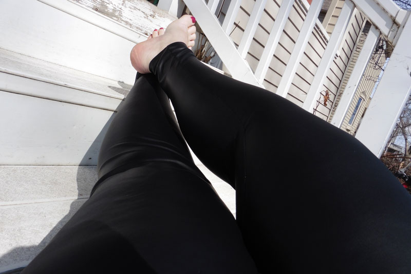 Several months ago, I spotted this “wet look” black spandex blend among JoAnn’s performance fabrics and bought it with the idea of “pleather” ‘Get Moving’ Leggings in mind. Once I got home, I realized I was sort of intimidated by the thought of sewing it and wearing “pleather,” so the idea kept sliding to the bottom of my to-do list. I finally worked up the courage to give it a try and am kind of loving how fierce they make me feel without being too far outside my comfort zone!