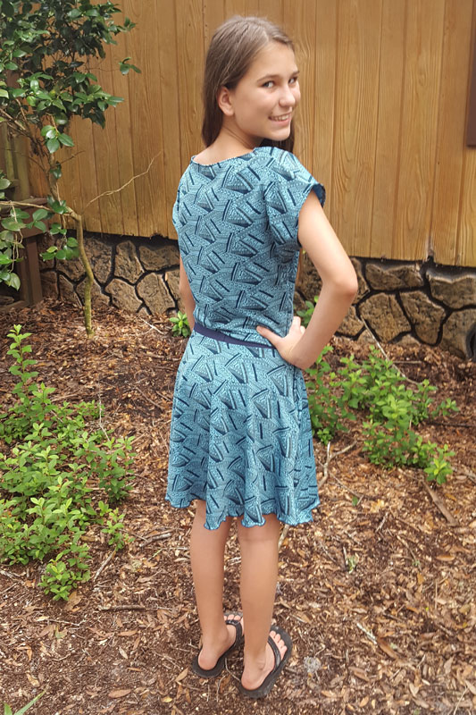 I decided that a Carlie’s Dolman Top mashed with the Girl’s Capsule Skirt would make the perfect dress for her. I’ve sewn this pattern mash before for my younger daughter and my older daughter and they’ve both worn it repeatedly until they outgrew them. It’s cool enough to garner teen approval, but not too grown-up looking for us moms who are “losing” our babies. Haha! I added navy blue elastic in the bodice/skirt seam to help stop the waistline from stretching out of shape. I also opted to do a rolled edge hemline in order to keep as much length as possible for this girl who’s sure to have a growth spurt soon!